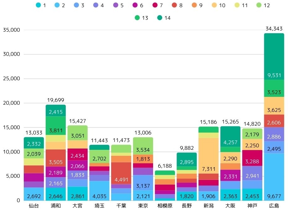 | 節 | ![]() 仙台 | ![]() 浦和 | 大宮 | ![]() 埼玉 | ![]() 千葉 | ![]() 東京 | ![]() 相模原 | ![]() 長野 | ![]() 新潟 | 大阪 | ![]() 神戸 | ![]() 広島 |